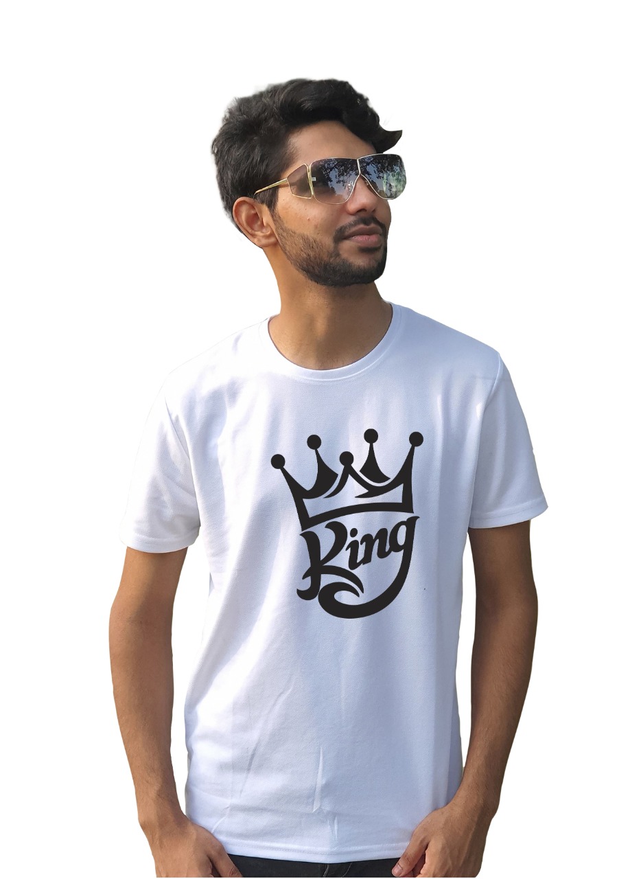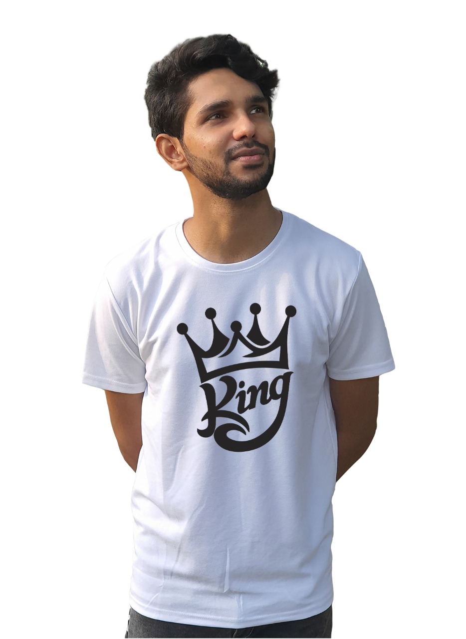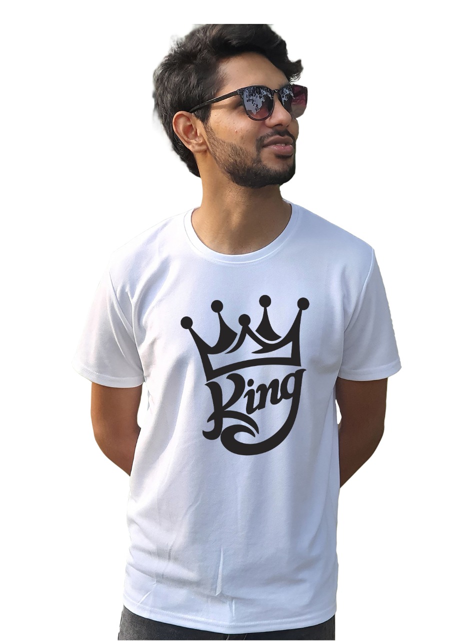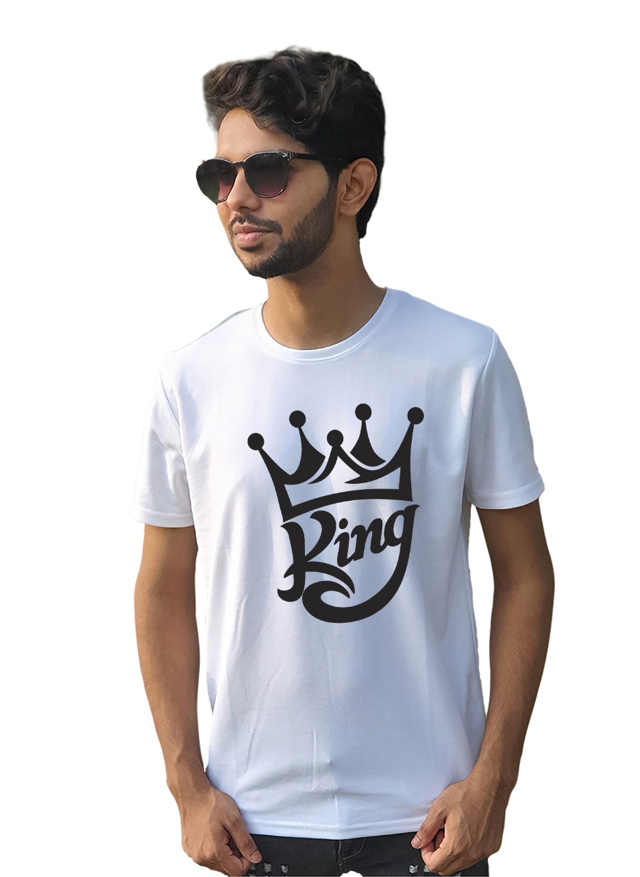 - King Logo Print Men’s Summer Trendy White T-Shirt. Pair this unique Round Neck T-shirt with your favorite pair of trousers and show your daring self to the world.